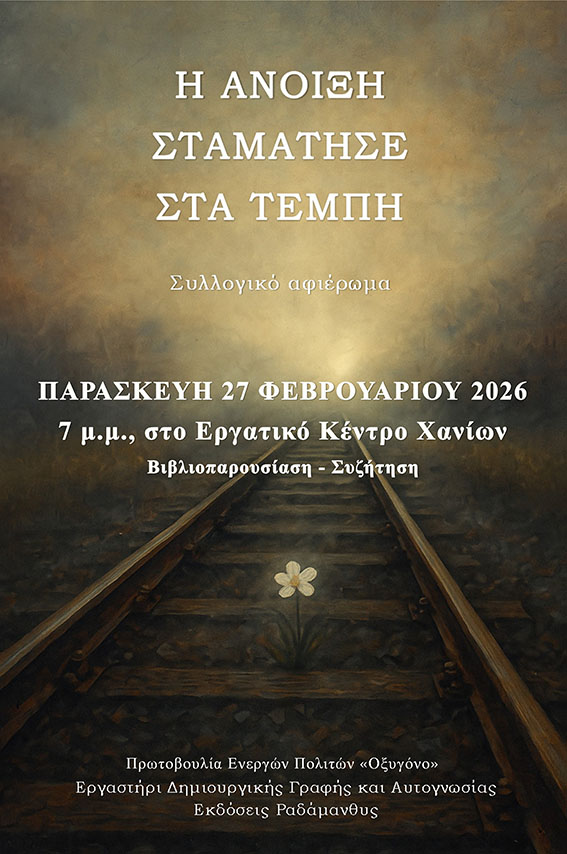 Μια εκδήλωση μνήμης, λόγου και συλλογικής ευθύνης διοργανώνουν οι Εκδόσεις Ραδάμανθυς σε συνεργασία με την Πρωτοβουλία Ενεργών Πολιτών «Οξυγόνο», στο πλαίσιο των δράσεων διαμαρτυρίας που θα πραγματοποιηθούν στα Χανιά για το έγκλημα των Τεμπών, το