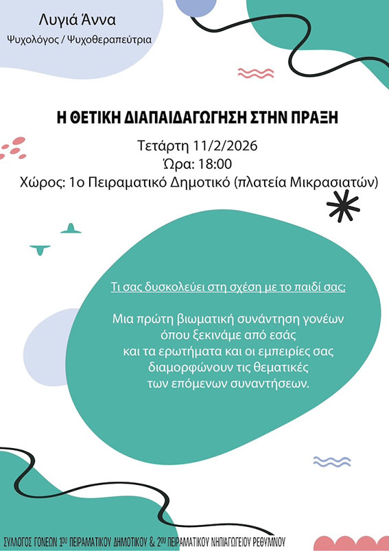 στις 18:00, στο 1ο Πειραματικό Δημοτικό Σχολείο Ρεθύμνου (Πλατεία Μικρασιατών), με την πρώτη βιωματική ομιλία του νέου κύκλου συναντήσεων που διοργανώνει ο Σύλλογος Γονέων και Κηδεμόνων του Πειραματικού Δημοτικού και Νηπιαγωγείου Ρεθύμνου.