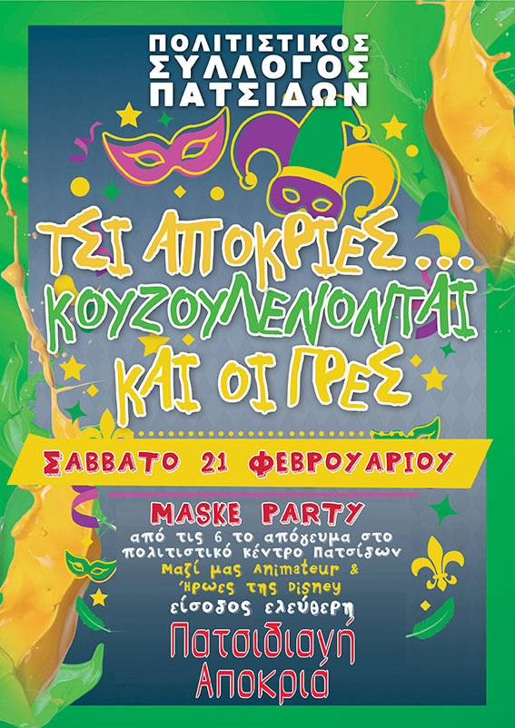από τις 18:00, στο Πολιτιστικό Κέντρο Πατσίδων, με την πιο κεφάτη γιορτή της χρονιάς, την Πατσιδιανή Αποκριά. Τσι αποκριές… κουζουλένονται και οι γρες!