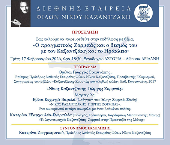Μια ξεχωριστή εκδήλωση μνήμης, γνώσης και πολιτισμού που φέρνει στο προσκήνιο την αληθινή ιστορία πίσω από τον μύθο του Ζορμπά και τον διαχρονικό δεσμό του με τον Νίκο Καζαντζάκη και την Κρήτη.