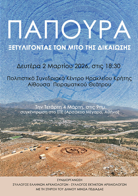 Στο πλαίσιο της δημόσιας ενημέρωσης για την επιστημονική έρευνα και τη σημασία του μνημείου, πραγματοποιείται με τη στήριξη του Δήμου Μινώα Πεδιάδας η εκδήλωση με τίτλο: «Παπούρα: Ξετυλίγοντας τον μίτο της δικαίωσης», τη