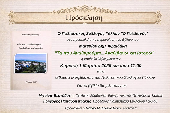 Ο Πολιτιστικός Σύλλογος Γάλλου «Ο Γαλλιανός» διοργανώνει την παρουσίαση του βιβλίου του Ματθαίου Δημ. Φραϊδάκη με τίτλο «Τα που Αναθυμούμαι… Αναθιβάνω και Ιστορώ», σε μια ξεχωριστή πολιτιστική συνάντηση που θα πραγματοποιηθεί την