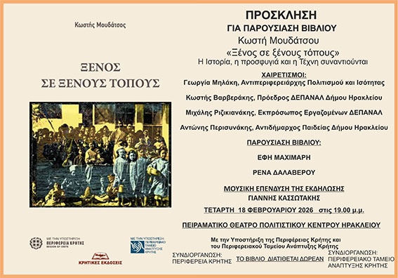 Μια ξεχωριστή πολιτιστική εκδήλωση αφιερωμένη στη μνήμη, την ιστορία και την ανθρώπινη εμπειρία της προσφυγιάς φιλοξενείται στο Ηράκλειο, με την παρουσίαση του νέου βιβλίου του Κωστή Μουδάτσου. Η εκδήλωση θα πραγματοποιηθεί την