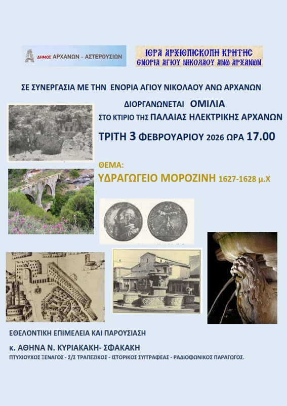 στις 17:00, στον συνεδριακό χώρο του πολυχώρου της Παλιάς Ηλεκτρικής Αρχανών, πραγματοποιείται η έναρξη μιας σειράς διαλέξεων και ξεναγήσεων με εισηγήτρια την Αθηνά Κυριακάκη Σφακάκη.