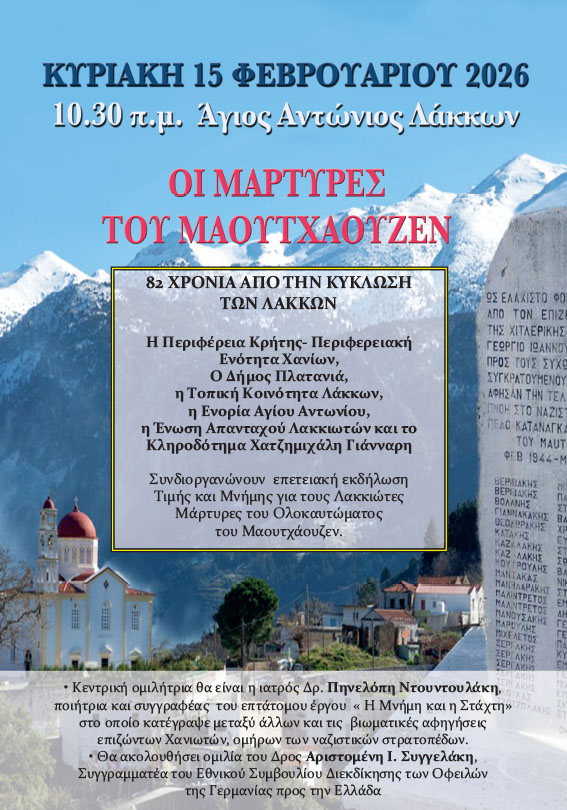 και ώρα 10:30 π.μ., στον ιστορικό Ιερό Ναό Αγίου Αντωνίου στους Λάκκους Χανίων, την καθιερωμένη επετειακή εκδήλωση Τιμής και Μνήμης για τους Λακκιώτες Μάρτυρες του Ολοκαυτώματος του Μαουτχάουζεν.