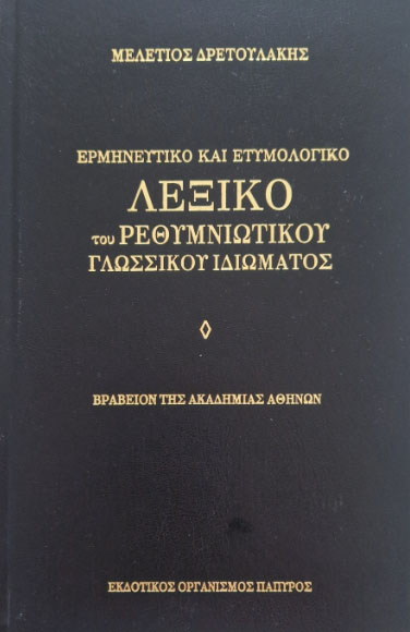 Το Λεξικό, που κυκλοφορεί από τον Εκδοτικός Οργανισμός Πάπυρος, έχει τιμηθεί με βράβευση από την Ακαδημία Αθηνών, αναγνωρίζοντας την επιστημονική του αξία και τη συμβολή του στη μελέτη και διαφύλαξη του τοπικού γλωσσικού ιδιώματος. Πρόκειται για ένα έργο ζωής που καταγράφει, ερμηνεύει και ετυμολογεί λέξεις και εκφράσεις του ρεθεμνιώτικου λόγου, φωτίζοντας πτυχές της ιστορίας, της καθημερινότητας και της πολιτισμικής μνήμης του τόπου.