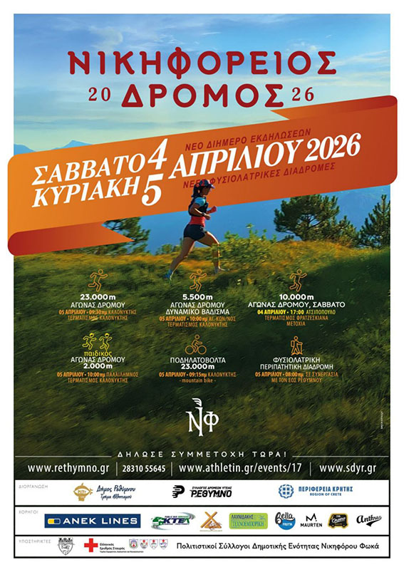 Σε μια αναβαθμισμένη, εμπλουτισμένη και ακόμα πιο δυναμική εκδοχή, επιστρέφει φέτος ο 11ος Νικηφόρειος Δρόμος, ένας θεσμός που έχει καταξιωθεί στο πέρασμα των χρόνων και αποτελεί σημείο αναφοράς για το δρομικό κίνημα όχι μόνο στο Ρέθυμνο και την Κρήτη, αλλά και σε ολόκληρη τη χώρα.