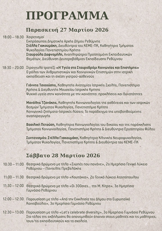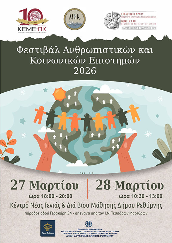 Η διοργάνωση υλοποιείται από το Κέντρο Ερευνών και Μελετών του Πανεπιστημίου Κρήτης για τις Ανθρωπιστικές, τις Κοινωνικές και τις Επιστήμες της Αγωγής, σε συνεργασία με το Τμήμα Παιδείας, Νέας Γενιάς και Δια Βίου Μάθησης του Δήμου Ρεθύμνης.