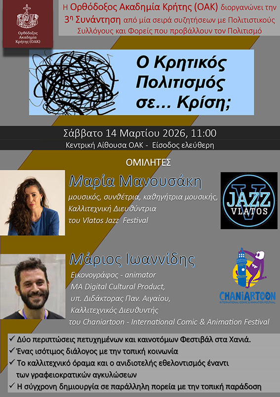 Με αυτό το σκεπτικό, η Ορθόδοξη Ακαδημία Κρήτης (ΟΑΚ) συνεχίζει τον κύκλο συζητήσεων με τίτλο «Ο Κρητικός Πολιτισμός σε… Κρίση;», με την 3η ημερίδα να πραγματοποιείται το