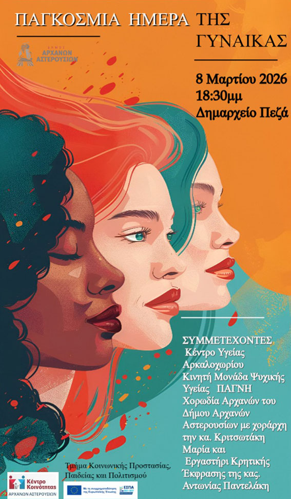 Με αφορμή την Παγκόσμια Ημέρα της Γυναίκας, το Τμήμα Κοινωνικής Προστασίας, Παιδείας και Πολιτισμού και το Κέντρο Κοινότητας του Δήμου Αρχανών – Αστερουσίων διοργανώνουν μια ιδιαίτερη εκδήλωση ενημέρωσης και πολιτισμού την