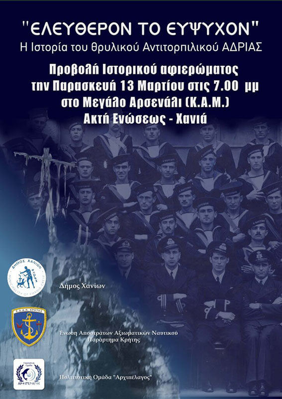 στις 19:00 θα παρουσιαστεί το ιστορικό αφιέρωμα με τίτλο «Ελεύθερον το Εύψυχον – Η ιστορία του θρυλικού Αντιτορπιλικού ΑΔΡΙΑΣ». Η εκδήλωση θα φιλοξενηθεί στο Μεγάλο Αρσενάλι (Κέντρο Αρχιτεκτονικής Μεσογείου), στο παλιό λιμάνι των Χανίων.