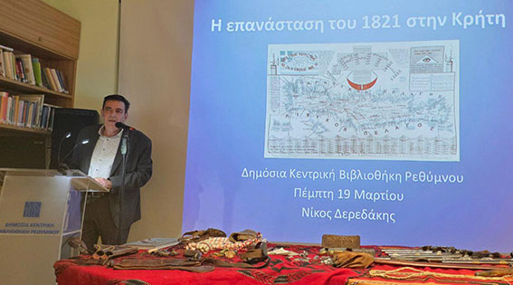 Στην κατάμεστη αίθουσα της Βιβλιοθήκης, ο εκπαιδευτικός και Αντιπρόεδρος του Εφορευτικού Συμβουλίου, Νίκος Δερεδάκης, παρουσίασε με σαφήνεια και παραστατικότητα τα πολεμικά και πολιτικά γεγονότα που εκτυλίχθηκαν στην Κρήτη από τον Μάιο του 1821, όταν ξεκίνησε η επανάσταση, έως και την υπογραφή του Πρωτοκόλλου της 22ας Ιανουαρίου 1830, που άφηνε το νησί εκτός των συνόρων του ελληνικού κράτους, παρά τις έντονες αντιδράσεις των Κρητών.