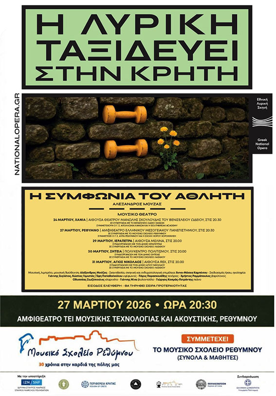 Πρόκειται για ένα πρωτοποριακό έργο του Αλέξανδρου Μούζα, που παρουσιάζεται από την Εθνική Λυρική Σκηνή και ταξιδεύει σε πόλεις της Κρήτης, σε συνεργασία με το Μουσικό Σχολείο Ρεθύμνου. Στην παράσταση συμμετέχουν επίσης ο Γ.Σ. Αύρα Ρεθύμνου και η σχολή χορού «Χοροκίνηση», δημιουργώντας μια πολυδιάστατη σκηνική εμπειρία.