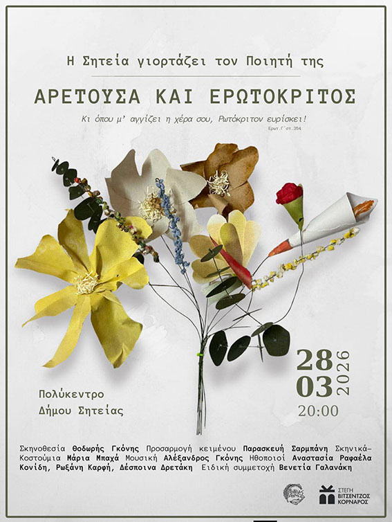 Στο πλαίσιο της εκδήλωσης θα παρουσιαστεί η θεατρική παράσταση «Η Αρετούσα και ο Ερωτόκριτος», παραγωγή της Στέγης «ΒΙΤΣΕΝΤΖΟΣ ΚΟΡΝΑΡΟΣ», βασισμένη στο κορυφαίο έργο του Βιτσέντζου Κορνάρου, σε σκηνοθεσία Θοδωρή Γκόνη.