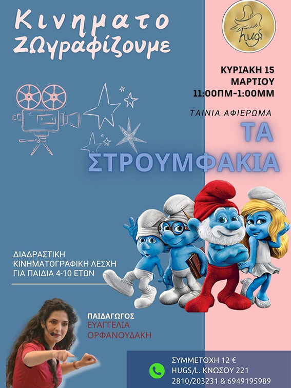 Η δράση αποτελεί μια διαδραστική κινηματογραφική λέσχη για παιδιά ηλικίας 4 έως 10 ετών, με αφετηρία κάθε φορά μια ταινία ή ένα κινηματογραφικό αφιέρωμα. Για τη συγκεκριμένη συνάντηση, το θέμα είναι τα αγαπημένα «Στρουμφάκια», που θα αποτελέσουν την έμπνευση για παιχνίδι, αφήγηση και δημιουργία.
