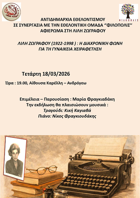 Μια ξεχωριστή εκδήλωση αφιερωμένη στη σπουδαία Ελληνίδα συγγραφέα και διανοούμενη Λιλή Ζωγράφου διοργανώνουν ο Δήμος Ηρακλείου – Αντιδημαρχία Εθελοντισμού και η