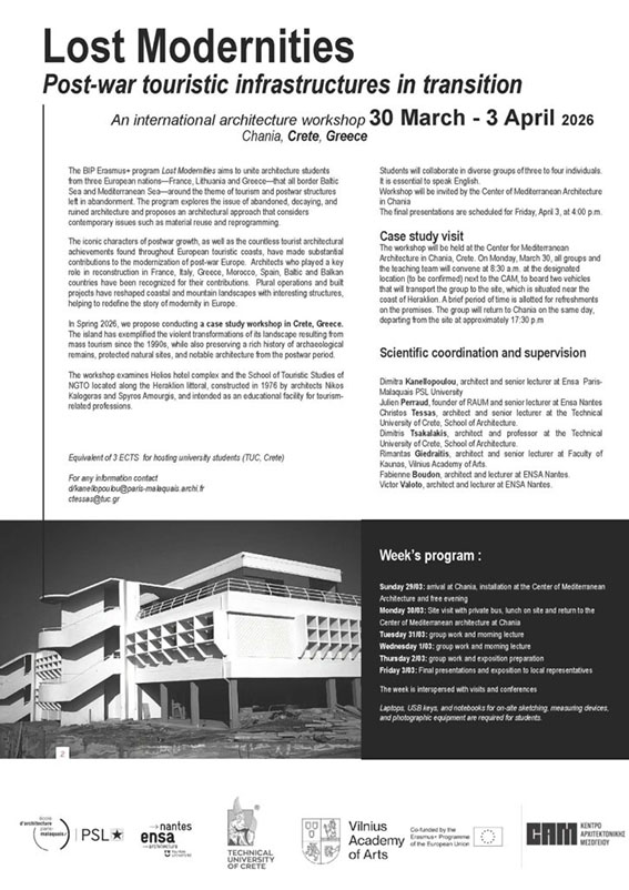 Το εργαστήριο επικεντρώνεται στη μελέτη και επαναπροσέγγιση των μεταπολεμικών τουριστικών υποδομών, διερευνώντας τη θέση τους στο σήμερα και τις δυνατότητες επανένταξής τους στο σύγχρονο αστικό και πολιτιστικό τοπίο. Μέσα από μια δημιουργική διαδικασία ανταλλαγής ιδεών και σχεδιαστικών προσεγγίσεων, οι συμμετέχοντες καλούνται να αναστοχαστούν πάνω σε έννοιες όπως η μνήμη, η μετάβαση και η επανανοηματοδότηση του χώρου.