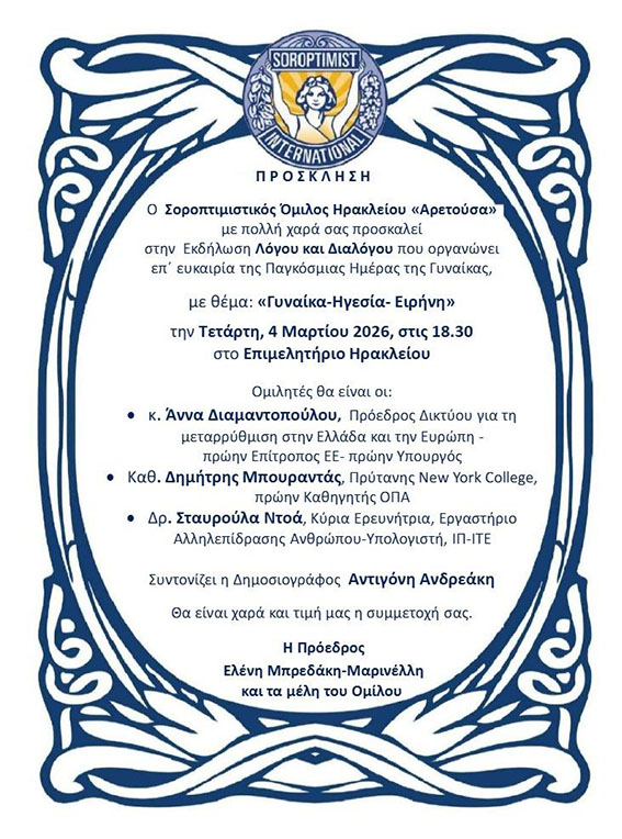Καθώς πλησιάζει η Παγκόσμια Ημέρα της Γυναίκας, η 8η Μαρτίου, ο Σοροπτιμιστικός Όμιλος Ηρακλείου «Αρετούσα» διοργανώνει μια εκδήλωση λόγου και διαλόγου με θέμα “Γυναίκα-Ηγεσία-Ειρήνη”, την πορεία της γυναίκας προς την ηγεσία, την