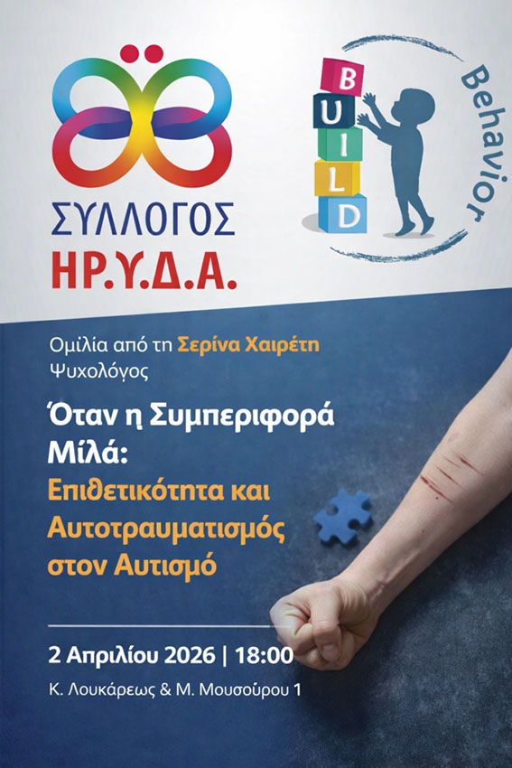 Μια σημαντική ενημερωτική δράση με επίκεντρο τον αυτισμό και τις σύγχρονες προσεγγίσεις κατανόησης της συμπεριφοράς διοργανώνει ο Σύλλογος ΗΡ.Υ.Δ.Α, προσκαλώντας το κοινό σε ομιλία με θέμα «Όταν η συμπεριφορά μιλά: Επιθετικότητα και αυτοτραυματισμός στον αυτισμό», η οποία θα πραγματοποιηθεί την