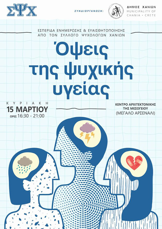 Μια σημαντική εσπερίδα ενημέρωσης και ευαισθητοποίησης με τίτλο «Όψεις της ψυχικής» διοργανώνει ο Σύλλογος Ψυχολόγων Χανίων, σε συνδιοργάνωση με το Τμήμα Κοινωνικής Πολιτικής του Δήμου Χανίων, την
