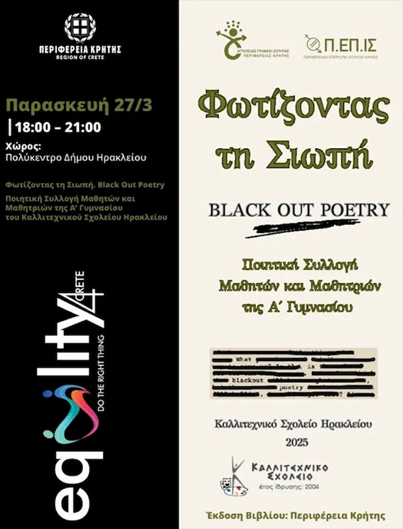 και ώρα 18:00, θα παρουσιαστεί η ποιητική συλλογή των μαθητών και μαθητριών της Α’ Γυμνασίου του Καλλιτεχνικού Σχολείου Ηρακλείου, με τίτλο «Φωτίζοντας τη Σιωπή – Black Out Poetry».