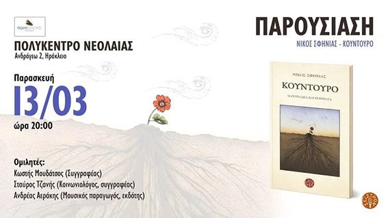 στις 20:00 ο εκδοτικός οίκος «Σείστρον» παρουσιάζει το βιβλίο «Κούντουρο» του Νίκου Σφηνιά. Η εκδήλωση θα φιλοξενηθεί στο Πολύκεντρο του Δήμου Ηρακλείου (Ανδρόγεω 2) και η είσοδος για το κοινό θα είναι ελεύθερη.