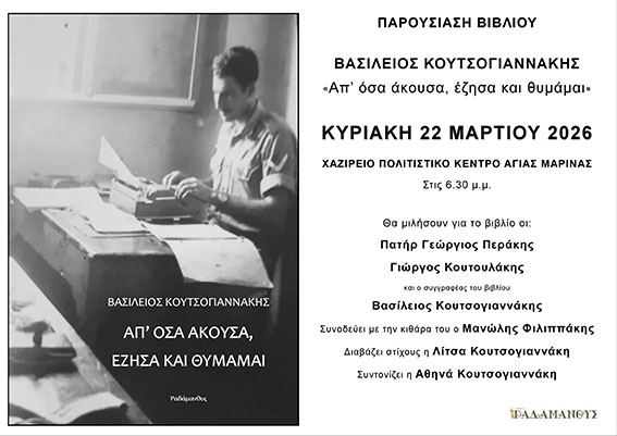 στο Χαζίρειο Πολιτιστικό Κέντρο Αγίας Μαρίνας, στις 18:30, με τις Εκδόσεις Ραδάμανθυς να παρουσιάζουν το νέο έργο του Βασίλη Κουτσογιαννάκη με τίτλο «Απ’ όσα άκουσα, έζησα και θυμάμαι».
