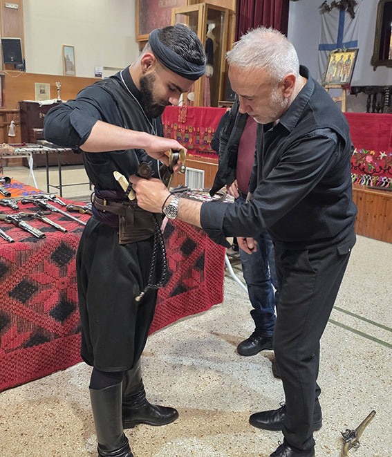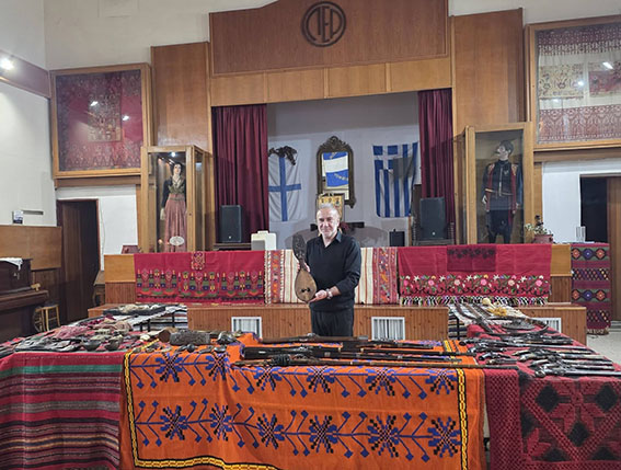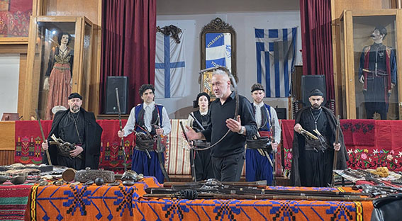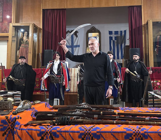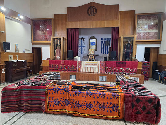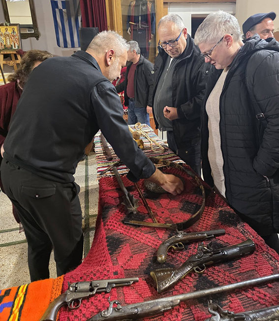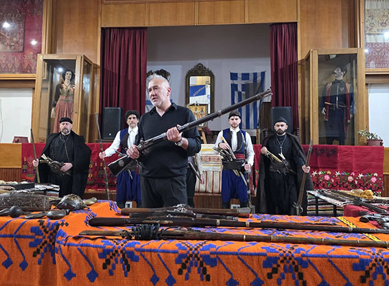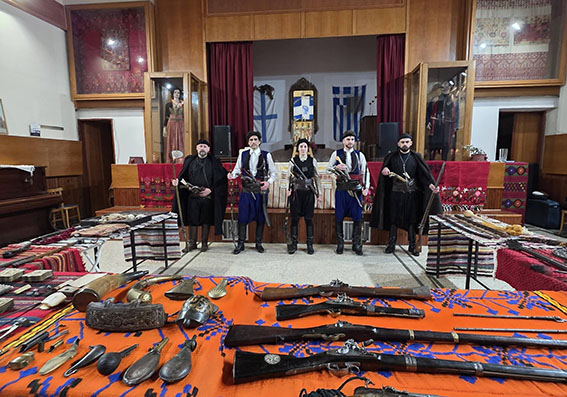 Πάνω σε παραδοσιακά υφαντά εκτέθηκαν παλαιά όπλα της Επανάστασης, όπως καριοφίλια και πιστόλες, μαχαίρια και γιαταγάνια, καθώς και εξαρτήματα οπλισμού και προσωπικά αντικείμενα των αγωνιστών.