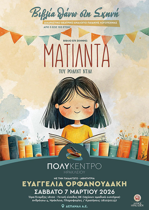 στις 18:00, με το διαδραστικό θεατρικό αναλόγιο να παρουσιάζει το βιβλίο «Ματίλντα» του Ρόαλντ Νταλ, ένα από τα πιο αγαπημένα έργα της παιδικής λογοτεχνίας.