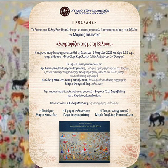 Μια ξεχωριστή πολιτιστική εκδήλωση αφιερωμένη στη λαϊκή δημιουργία και την τέχνη της κεντητικής διοργανώνει το Λύκειο των Ελληνίδων – Παράρτημα Ηρακλείου, το οποίο προσκαλεί το κοινό στην παρουσίαση του βιβλίου της Μαρίας Γαλανάκη με τίτλο «Ζωγραφίζοντας με τη Βελόνα».