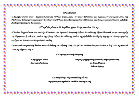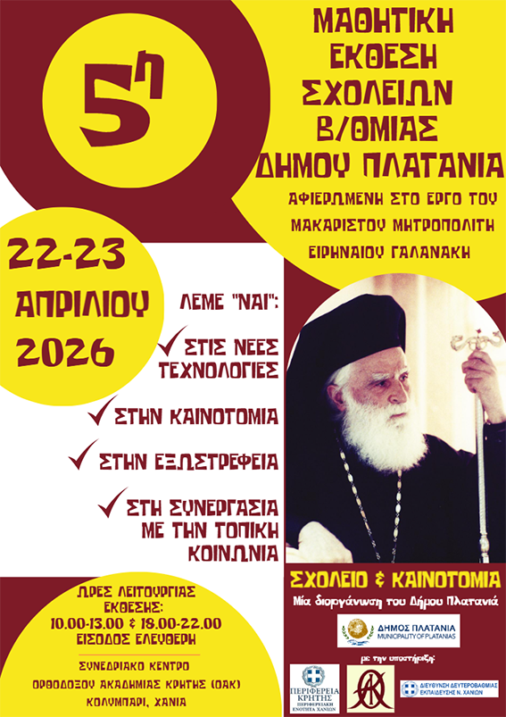 Ο Δήμος Πλατανιά και η Δημοτική Επιτροπή Β/θμιας Εκπαίδευσης διοργανώνουν την 5η Μαθητική Έκθεση Δημιουργίας των Σχολείων Β/θμιας Εκπαίδευσης, η οποία θα πραγματοποιηθεί στις