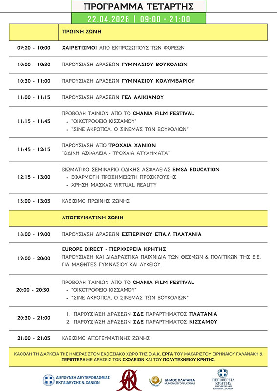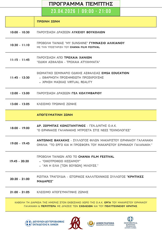 Η δεύτερη ημέρα, Πέμπτη 23 Απριλίου, περιλαμβάνει ένα πλούσιο πρόγραμμα με παρουσιάσεις μαθητικών δράσεων από το Λύκειο Βουκολιών και το ΓΕΛ Κολυμπαρίου, προβολή της ταινίας «My Sunshine» από το Γυμνάσιο Αλικιανού με την υποστήριξη του Chania Film Festival, καθώς και παρουσίαση της Τροχαίας Χανίων με θέμα την οδική ασφάλεια.