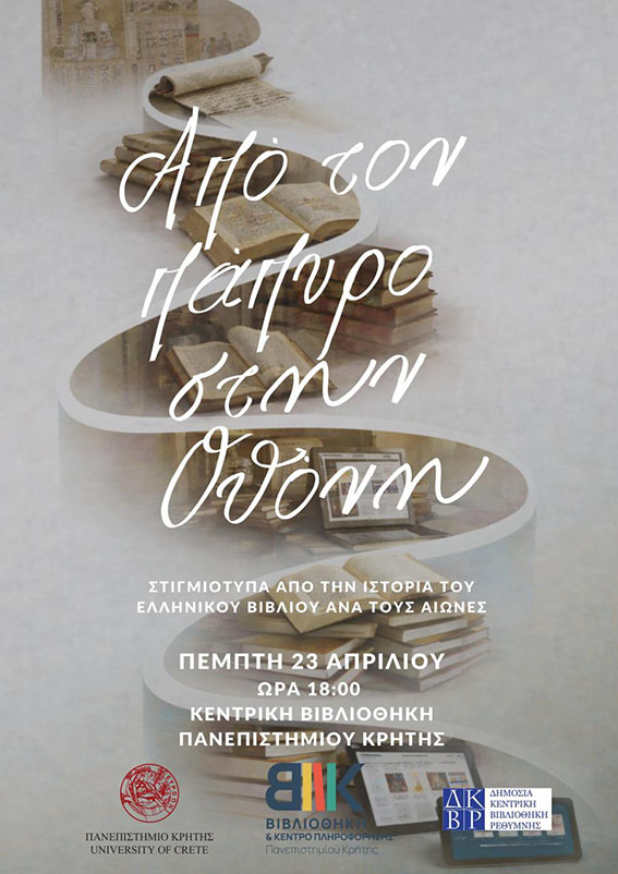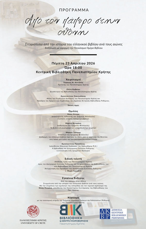 Η Βιβλιοθήκη του Πανεπιστημίου Κρήτης και η Δημόσια Κεντρική Βιβλιοθήκη Ρεθύμνου συνεορτάζουν με τη μεγάλη εκδήλωση «Από τον πάπυρο στην οθόνη. Στιγμιότυπα του ελληνικού βιβλίου ανά τους αιώνες», που θα πραγματοποιηθεί την