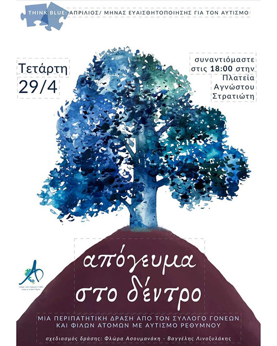και ώρα 18:00, με σημείο εκκίνησης την Πλατεία Αγνώστου Στρατιώτη, στο πλαίσιο του Think Blue και του Απριλίου, μήνα ευαισθητοποίησης για τον αυτισμό.