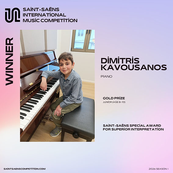 Αντίστοιχα, στον διεθνή διαγωνισμό Saint-Saëns International Music Competition, ο Δημήτρης Καβουσανός (9 ετών) κατέκτησε επίσης το Gold Prize στην ίδια ηλικιακή κατηγορία, λαμβάνοντας επιπλέον και ειδικό βραβείο για ανώτερη ερμηνεία, μια διάκριση που υπογραμμίζει το ιδιαίτερο καλλιτεχνικό του αποτύπωμα.