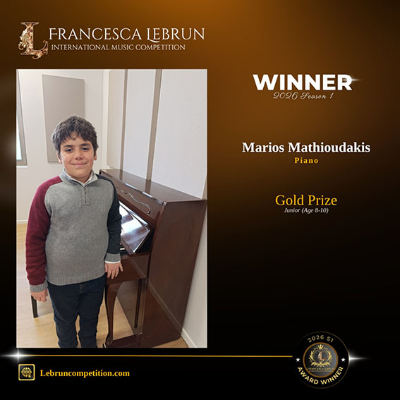 Στον διεθνή διαγωνισμό Francesca Lebrun International Music Competition, ο Μάριος Μαθιουδάκης (10 ετών) απέσπασε το Gold Prize στην κατηγορία πιάνου για ηλικίες 8-10 ετών, αποδεικνύοντας το ταλέντο και τη μεθοδική του εξέλιξη.