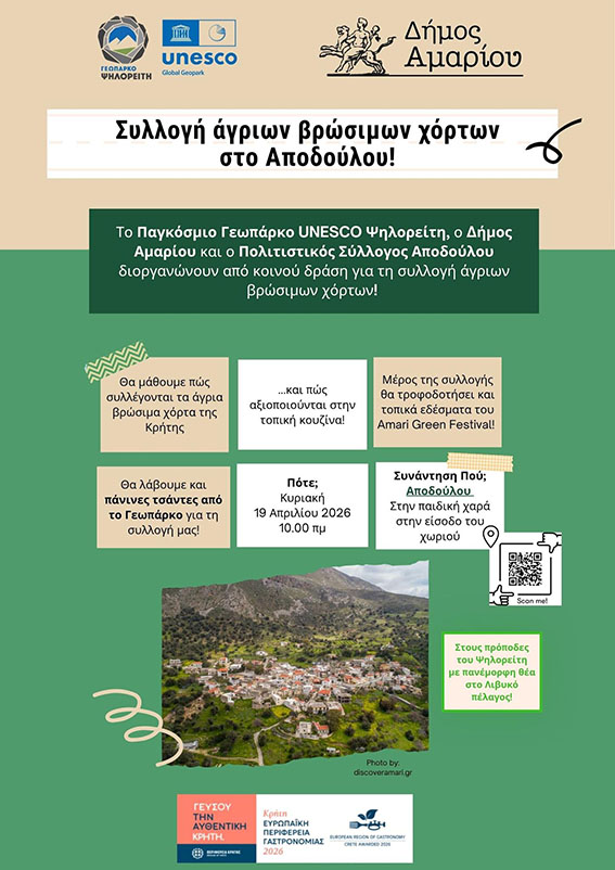 Η δράση συλλογής άγριων βρώσιμων χόρτων διοργανώνεται από το Ψηλορείτης Παγκόσμιο Γεωπάρκο UNESCO, τον Δήμο Αμαρίου και τον Πολιτιστικό Σύλλογο Αποδούλου, στο πλαίσιο του έργου «Κρήτη – Ευρωπαϊκή Περιφέρεια Γαστρονομίας 2026», με στόχο την ανάδειξη και προώθηση της πλούσιας κρητικής γαστρονομικής κουλτούρας.