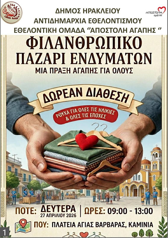 Μια σημαντική δράση προσφοράς και αλληλεγγύης διοργανώνεται στο Ηράκλειο, μέσα από το Φιλανθρωπικό Παζάρι Ενδυμάτων – Υποδημάτων που υλοποιεί η Αποστολή Αγάπης Εθελοντική Ομάδα Αλληλεγγύης, σε συνεργασία με την Αντιδημαρχία Εθελοντισμού του Δήμου Ηρακλείου. Η εκδήλωση θα πραγματοποιηθεί τη