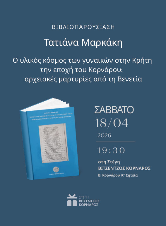 Η Στέγη ΒΙΤΣΕΝΤΖΟΣ ΚΟΡΝΑΡΟΣ προσκαλεί το κοινό σε μια ιδιαίτερη βραδιά γνώσης και ιστορικής αναζήτησης, με αφορμή την παρουσίαση του βιβλίου της Τατιάνας Μαρκάκη με τίτλο «Women and Material Culture in 17th-Century Crete. Insights from the Venetian Notarial Archives». Η εκδήλωση θα πραγματοποιηθεί το