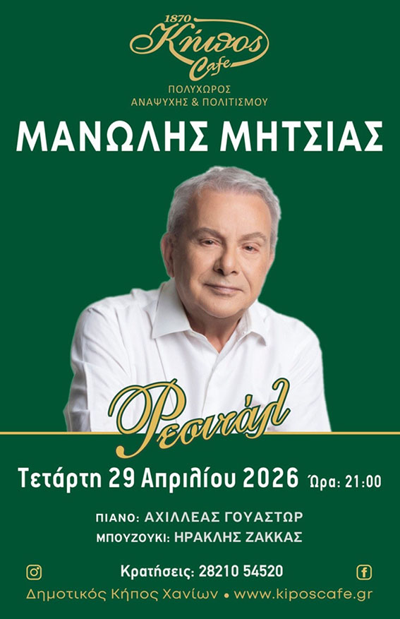 Μια ξεχωριστή μουσική εμπειρία αναμένεται να ζήσει το κοινό των Χανίων, καθώς ο Μανώλης Μητσιάς ανεβαίνει στη σκηνή του ιστορικού Κήπος Café, στον Δημοτικό Κήπο Χανίων, την