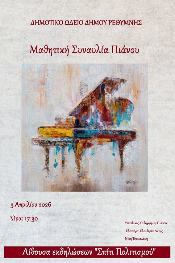 Μια ξεχωριστή μουσική βραδιά γεμάτη μελωδίες, ταλέντο και δημιουργική έκφραση ετοιμάζει το Δημοτικό Ωδείο Ρεθύμνης, προσκαλώντας το κοινό σε μια μαθητική συναυλία πιάνου που αναδεικνύει τη δουλειά και την πρόοδο των σπουδαστών του.