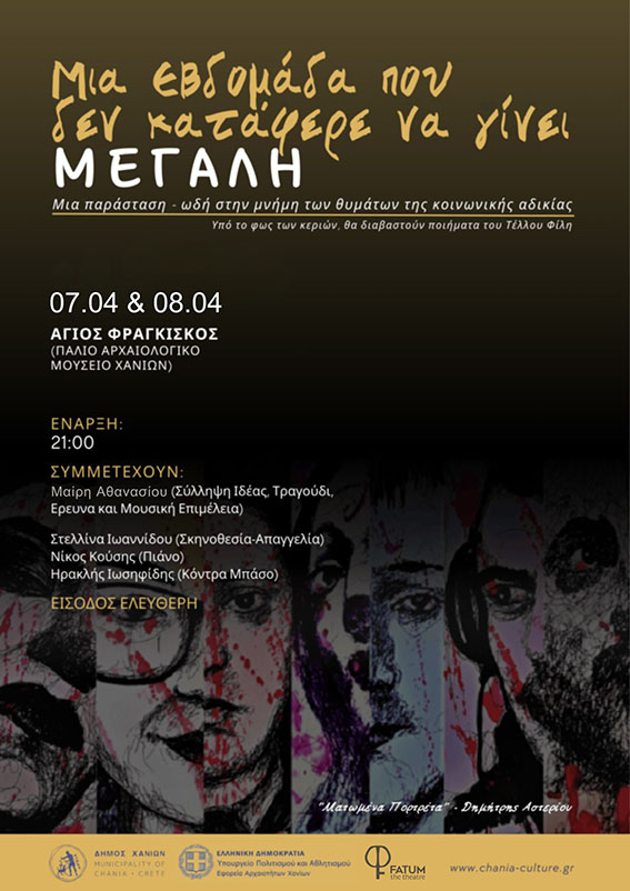 Μια ιδιαίτερη μουσικο-ποιητική παράσταση μνήμης και τιμής φιλοξενείται στα Χανιά, στον Ιερό Ναό Αγίου Φραγκίσκου (Παλιό Αρχαιολογικό Μουσείο), τη