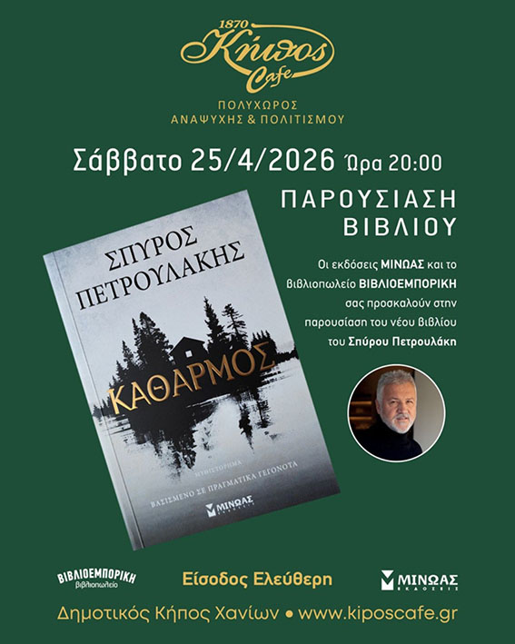 Μια ξεχωριστή βραδιά αφιερωμένη στη σύγχρονη ελληνική λογοτεχνία και τη δύναμη της αφήγησης έρχεται στα Χανιά, με την παρουσίαση του νέου βιβλίου του αγαπημένου συγγραφέα Σπύρου Πετρουλάκη, με τίτλο «Καθαρμός», το