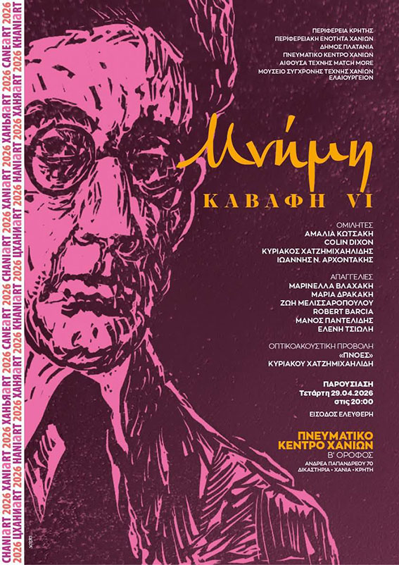 Μια ξεχωριστή πολιτιστική βραδιά αφιερωμένη στον Κωνσταντίνος Π. Καβάφης θα φιλοξενηθεί στον 2ο όροφο του Πνευματικό Κέντρο Χανίων, με την εσπερίδα «Μνήμη Καβάφη VI» και την παράλληλη έκθεση σύγχρονης τέχνης «Έλλην Αλεξανδρινός Ποιητής VI», την