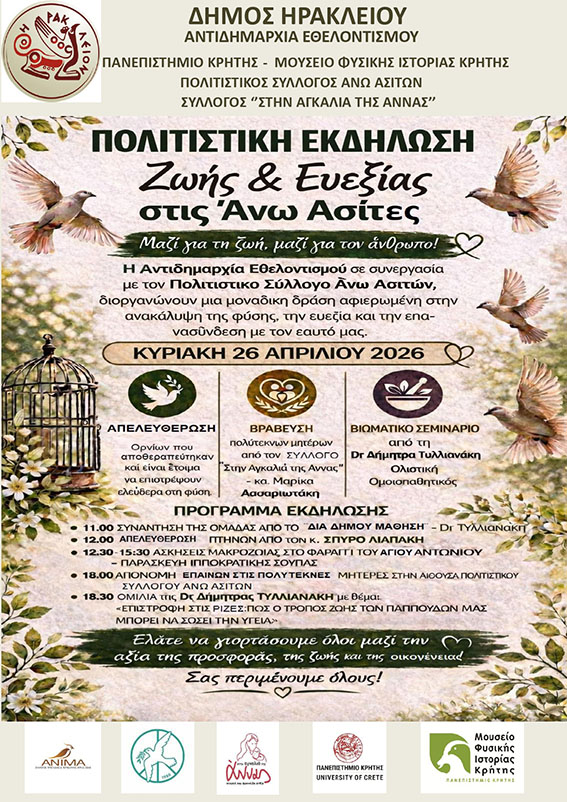 Η εκδήλωση διοργανώνεται από την Αντιδημαρχία Εθελοντισμού του Δήμου Ηρακλείου, σε συνεργασία με το Πανεπιστήμιο Κρήτης, το Μουσείο Φυσικής Ιστορίας Κρήτης, τον Πολιτιστικό Σύλλογο Άνω Ασιτών και τον Σύλλογο «Στην Αγκαλιά της Άννας», αναδεικνύοντας τη δύναμη της συνεργασίας και της προσφοράς.