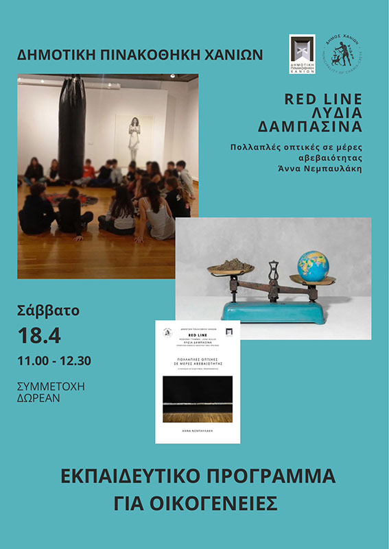 Η Δημοτική Πινακοθήκη Χανίων και ο Δήμος Χανίων προσκαλούν οικογένειες να συμμετάσχουν σε ένα δημιουργικό και βιωματικό εκπαιδευτικό πρόγραμμα, που πραγματοποιείται με αφορμή την έκθεση «Red Line» της Λυδίας Δαμπασίνα το