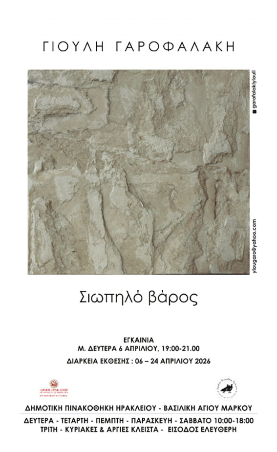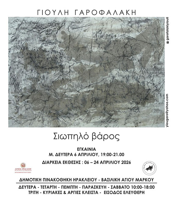 Η Δημοτική Πινακοθήκη Ηρακλείου, στη Βασιλική του Αγίου Μάρκου, φιλοξενεί την ατομική έκθεση της Γιούλης Γαροφαλάκη με τίτλο «Σιωπηλό βάρος», η οποία ανοίγει τις πύλες της τη