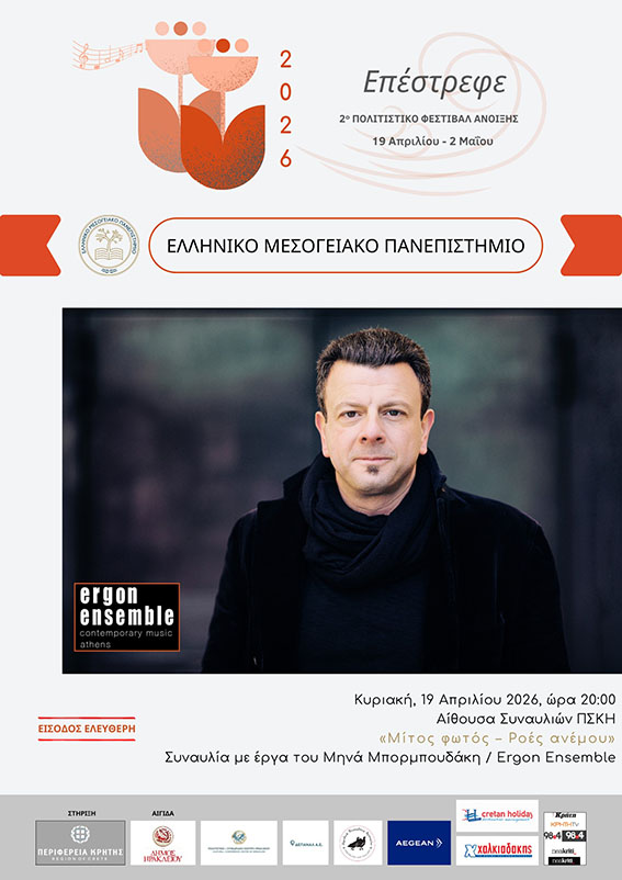 Με μια ξεχωριστή μουσική συνάντηση ανοίγει το 2ο Πολιτιστικό Φεστιβάλ Άνοιξης του Ελληνικού Μεσογειακού Πανεπιστημίου, παρουσιάζοντας τη συναυλία