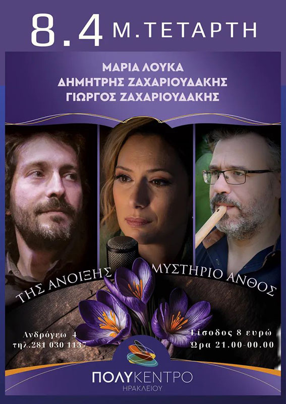 στις 21:00, στο Πολύκεντρο Δήμου Ηρακλείου. Η Μαρία Λούκα, μαζί με τους Δημήτρη και Γιώργο Ζαχαριουδάκη, παρουσιάζουν ένα πρόγραμμα γεμάτο εσωτερικότητα, συγκίνηση και τρυφερότητα, ιδανικά εναρμονισμένο με το πνεύμα της Μεγάλης Εβδομάδας.