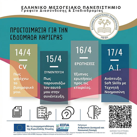 Το Γραφείο Διασύνδεσης και Σταδιοδρομίας του Ελληνικού Μεσογειακού Πανεπιστημίου (ΕΛΜΕΠΑ), σε συνεργασία με τα Ακαδημαϊκά Τμήματα και τις Σχολές του Ιδρύματος, προσκαλεί φοιτητές, φοιτήτριες και αποφοίτους στην